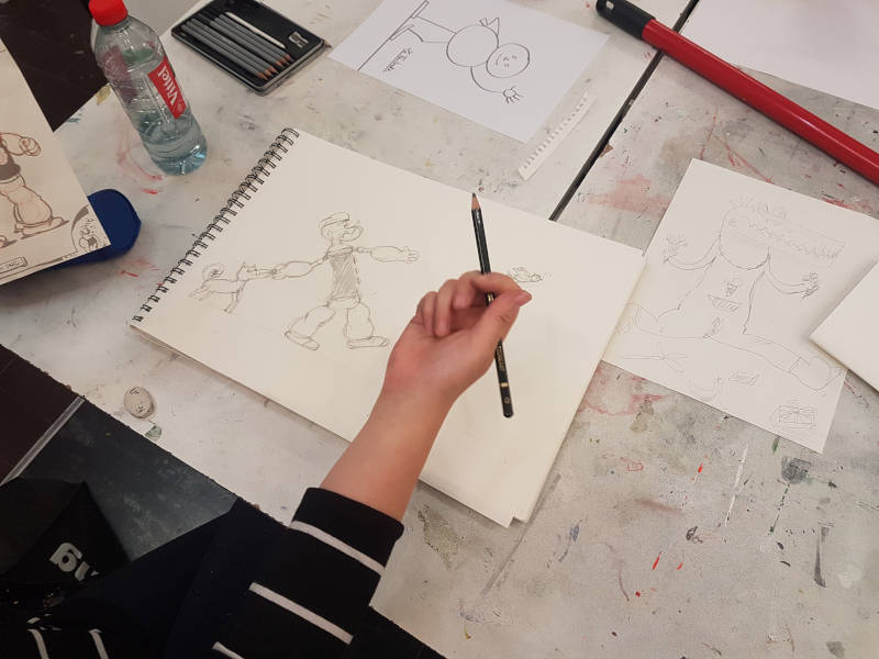 Le dessin d’imagination se distingue du dessin d’observation en ce qu’il consiste à se passer de modèle à reproduire. On ne s’appuie donc pas sur un modèle vivant, une nature morte ou une reproduction d’œuvre, mais uniquement sur notre imagination. On peut appliquer le dessin d’imagination dans le dessin de bande dessinée, mais pas uniquement. Les cours d’Ambroise se font en petits groupes, 5 élèves maximum, ce qui permet d’avoir un grand nombre de conseils individualisés. Ambroise donne des exercices personnalisés, en fonction du niveau de l’élève et de son projet. On peut aussi travailler sur son projet personnel, que ce soit une bande dessinée ou autre.